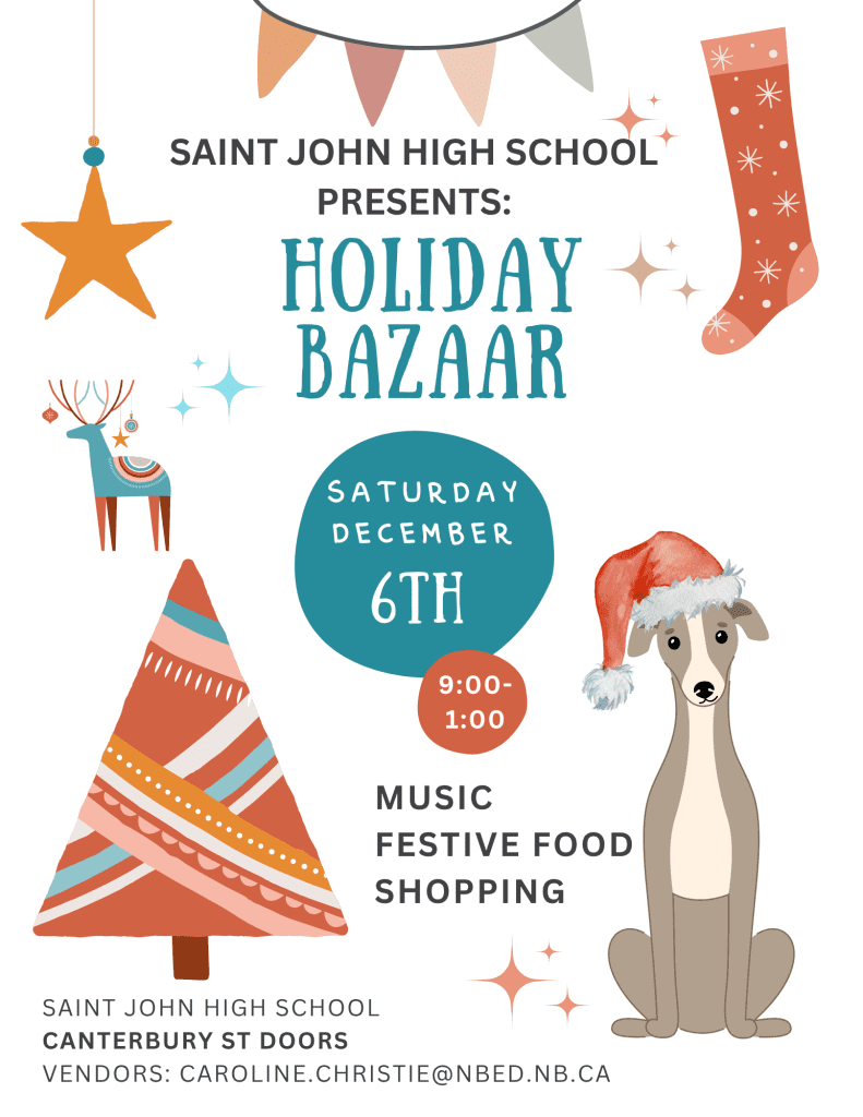 A favourite holiday market in beautiful Uptown Saint John. Support local vendors, enjoy ethereal music from our choir, sip a gourmet coffee and petit four at our café français, take a night off from cooking with our famous bean dinner and peruse our items at our silent auction! Support our school clubs and sports teams to enhance our students’ learning. ENTER THROUGH PLAZA DOORS ON CANTERBURY STREET.